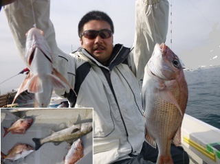 潮時につれ転々とポイントを回ると どのポイントも漁探知機には良い反応ありましたが反応の割りには食い渋りの真鯛釣果でした。